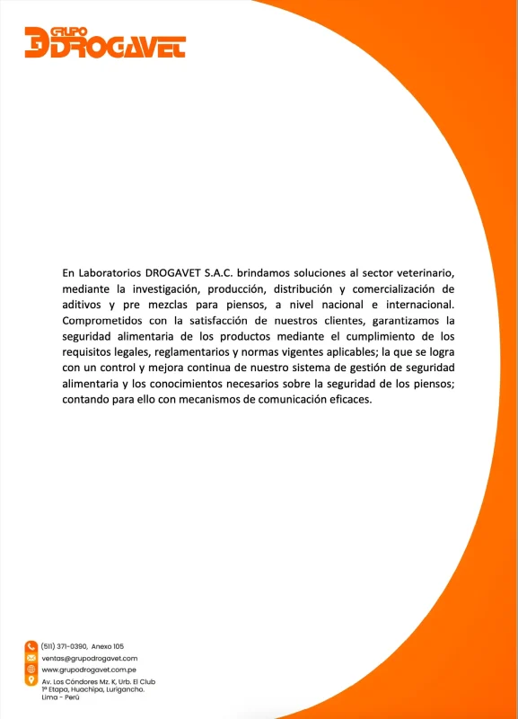 Laboratorios Drogavet, empresa líder peruana de reconocida trayectoria en la innovación y fabricación de productos de uso pecuario, con una metodología propia y única, altamente intensiva en investigación, desarrollo y tecnología de alta gama.
