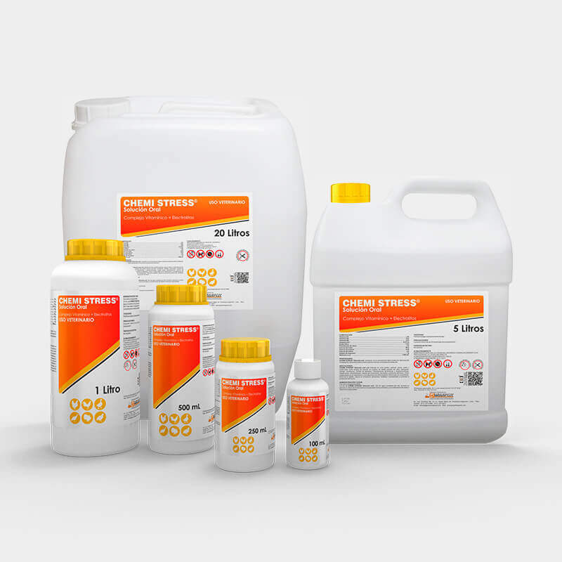 CHEMI STRESS Solución oral está indicado en aves (pollos, gallinas, pavos, patos y codornices) como terapia de soporte en cuadros de estrés (exceso de calor, transporte, manejo, vacunación, cambio de alimento). Intoxicaciones alimenticias y medicamentosas, hígado graso, deshidratación, retardo del crecimiento, dermatitis y emplume deficiente. Como coadyuvante en el tratamiento o convalecencia de enfermedades infecciosas y/o parasitarias. Estimula el apetito, mejora la conversión alimenticia, fertilidad, incubabilidad y aumenta la producción de huevo.