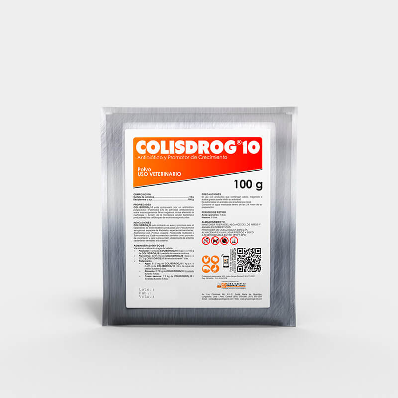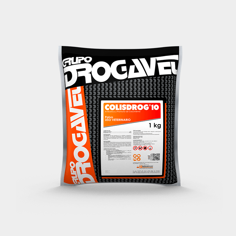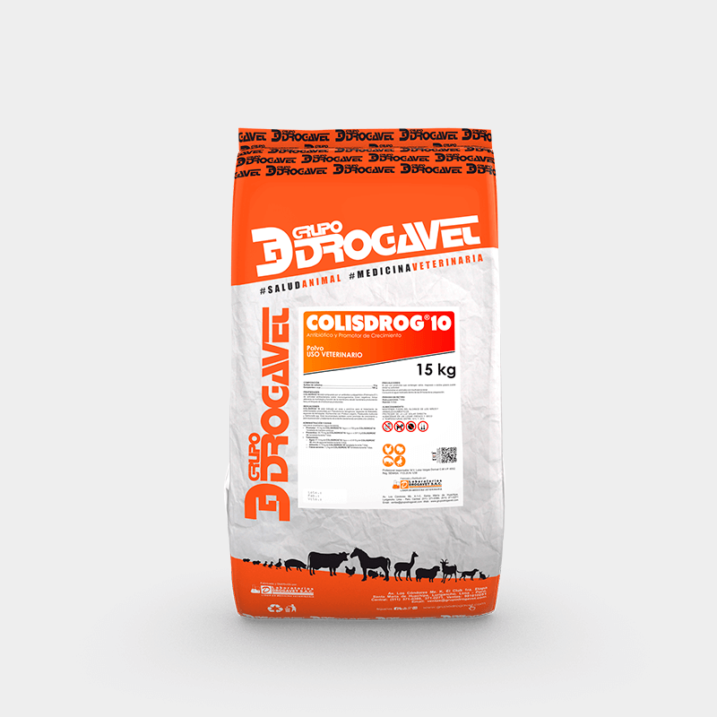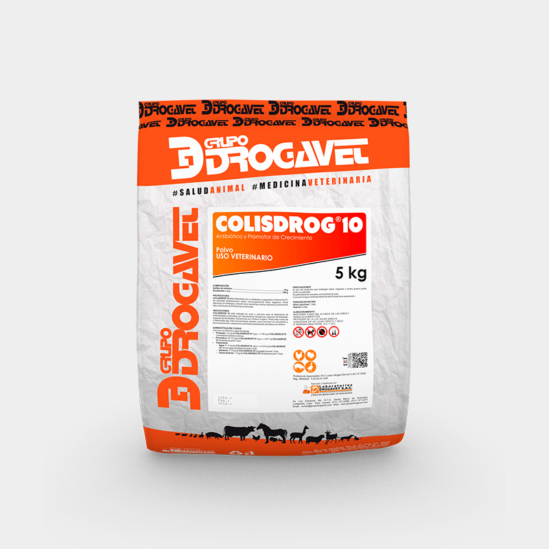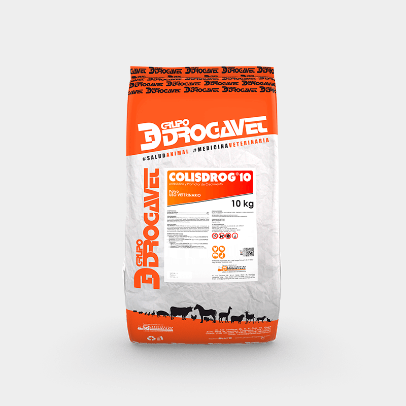 INDICACIONES: COLISDROG 10 está indicado en aves y porcinos para el tratamiento de enfermedades producidas por Pseudomona aeruginosa, especies de Klebsiella, especies de aerobacter, Escherichilla coli, Proteus vulgaris, Pasteurella multocida, salmonella ssp. Está recomendado también como promotor de crecimiento y, para la prevención y tratamiento de enteritis bacterianas sensibles a la colistina.