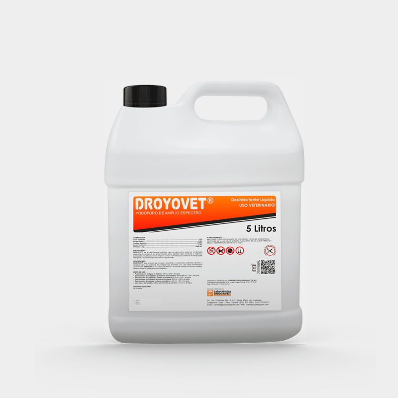 DROYOVET is an iodophor disinfectant, whose active principle (iodine) is gradually released by exerting its biocidal action on Gram positive and Gram negative bacteria, protozoa, yeasts, fungi, spores and viruses. Formulated with substances of effective detergent and penetration power, with action in hard water.