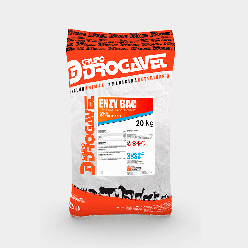 ENZYBAC posee Bacillus subtilis y Bacillus licheniformis que mantienen el equilibrio de la microbiota intestinal (exclusión competitiva) favoreciendo la mejora de los parámetros productivos, incrementando la inmunidad y promoviendo la absorción y digestión de nutrientes. Esto debido a que estos probióticos mejoran la producción de inmunoglobulinas (IgY, IgA y IgM), reducen la expresión de interleuquinas inflamatorias (IL-1, IL-6) y mejora la actividad de las enzimas antioxidantes (superóxido dismutasa, glutatión peroxidasa y catalasa) mejorando de manera íntegra el sistema inmune del animal.