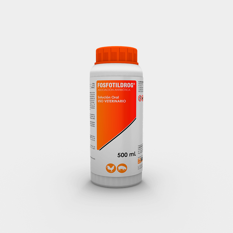 FOSFOTILDROG es la asociación sinérgica de dos antibióticos bactericidas, donde la fosfomicina perteneciente a la familia de derivados del ácido fosfórico, actúa inhibiendo la formación de la pared bacteriana de microorganismos gram positivos y negativos como la E. coli, Pasteurella spp., Haemophilus spp., Salmonella spp., ORT, Klebsiella sp., Pseudomonas, Shigella sp. Y el tartrato de tilosina, macrólido apropiado para el control de Micoplasma y el mantenimiento del tracto respiratorio limpio de agentes microbianos secundarios.