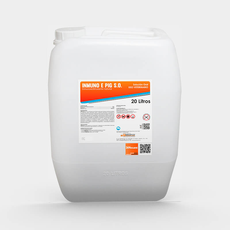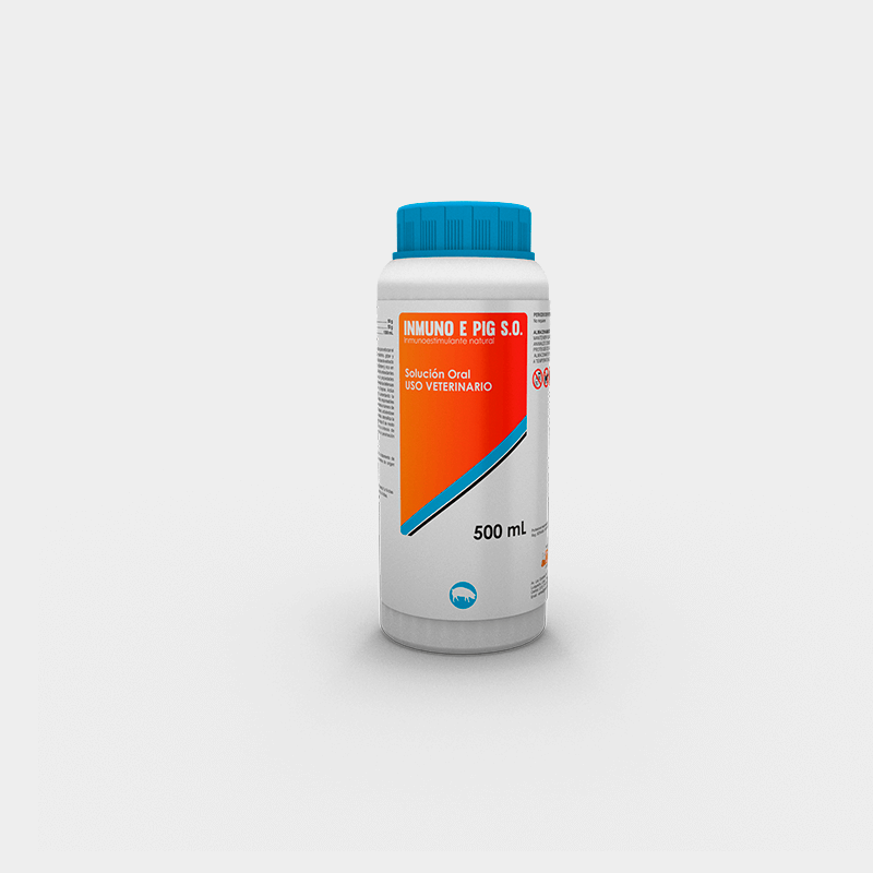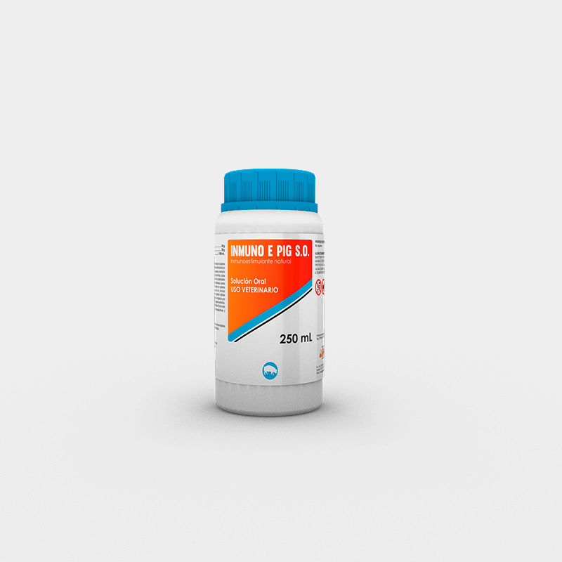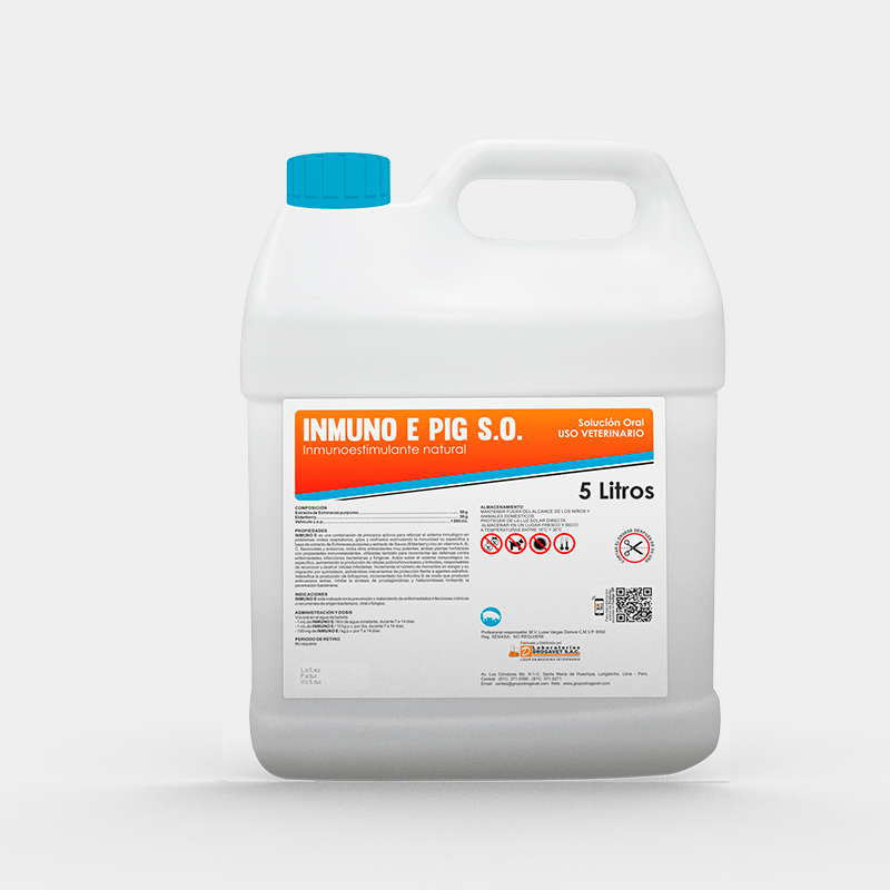 INMUNO E PIG S.O. es una combinación de extracto de Echinacea purpurea, extracto de sauco (elderberry) y extracto de cardo mariano, rico en vitaminas, potentes antioxidantes e inmunoestimulantes contra enfermedades e infecciones bacterianas, fúngicas y virales. Actúa aumentando la producción de células polimorfonucleares, linfocitos, y monocitos en sangre, activando mecanismos de protección frente a agentes extraños. Intensifica la producción de linfoquinas, incrementando los linfocitos B e inhibe la síntesis de prostaglandinas y hialuronidasas limitando la penetración bacteriana.