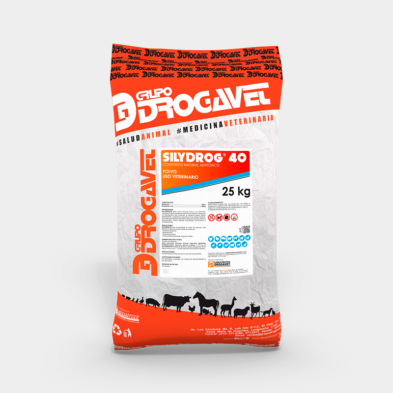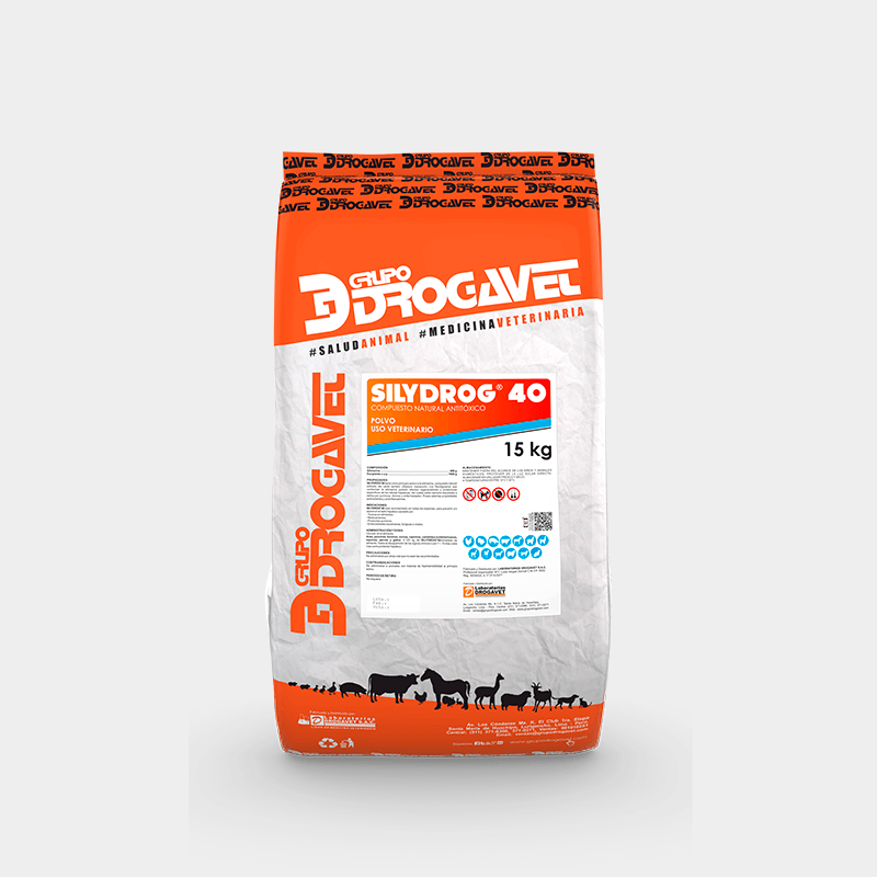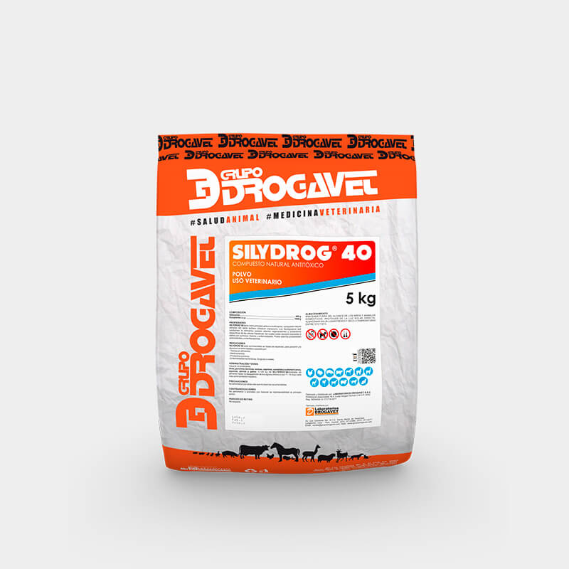 INDICACIONES: SILYDROG 40 se recomienda para todas las especies, para prevenir y/o disminuir el daño hepático causado por:2Toxinas en alimentos.3Medicamentos.4Productos químicos.5Enfermedades bacterianas, fúngicas o virales.