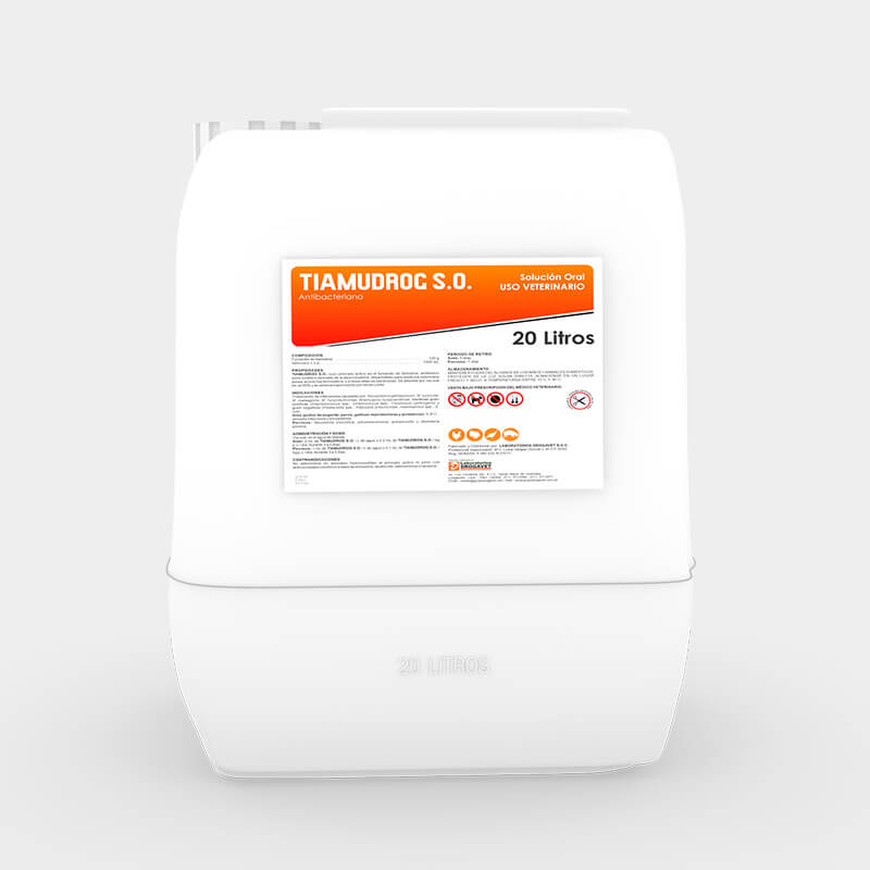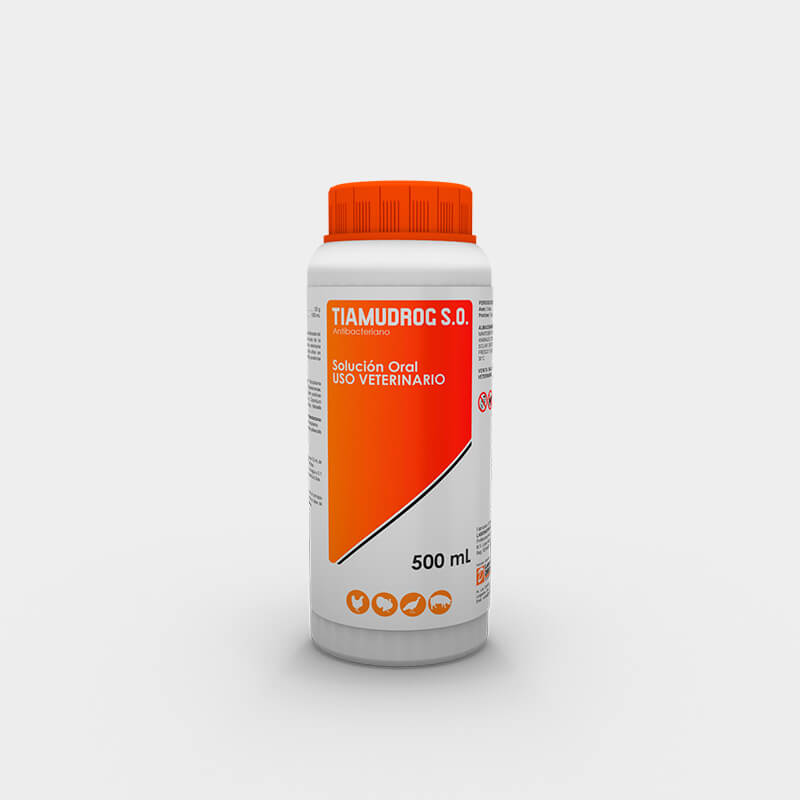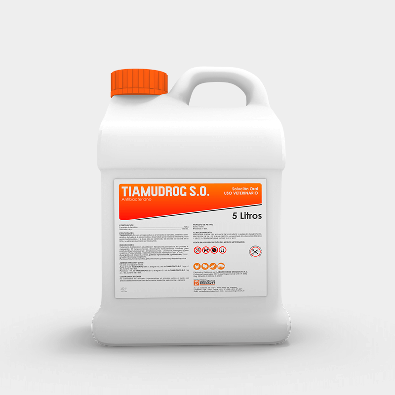 TIAMUDROG S.O. cuyo principio activo es el fumarato de tiamulina, antibiótico semi-sintético derivado de la pleuromutilina, desarrollado para medicina veterinaria posee acción bacteriostática, y a dosis altas es bactericida. Se absorbe por vía oral en un 90% y se elimina mayormente por heces y bilis.