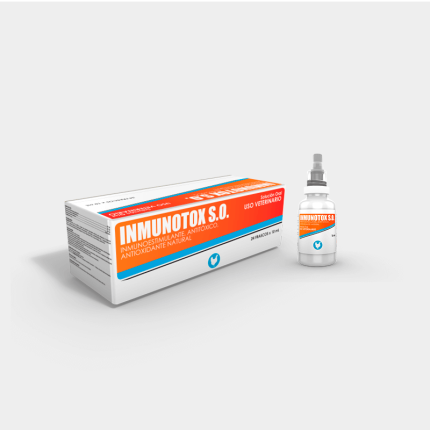 INMUNOTOX is a functional additive, based on natural active extracts, that reinforce the immune system (in viral and respiratory problems), stimulating non-specific immunity. Echinacea purpurea has antiviral properties and elderberry extract is rich in vitamins A, B, C, flavonoids and anthocyanins. All of them very powerful antioxidants precursors of glutathione, very powerful antioxidant that helps eliminate all toxins and free radicals, its detoxifying action consists in adhering these toxins to its surface and then expelling them through feces or bile. Milk thistle extract has specific protective effects of liver cells exposed to damage caused by chemicals, drugs, diseases and toxic diets and antioxidant, anti-inflammatory and regenerative properties that increase the defenses against diseases bacterial, fungal infections and natural peptides as a source of glutathione precursors.